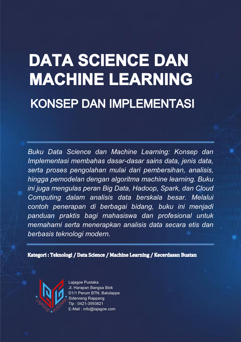 Buku Data Science dan Machine Learning: Konsep dan Implementasi membahas dasar-dasar sains data, jenis data, serta proses pengolahan mulai dari pembersihan, analisis, hingga pemodelan dengan algoritma machine learning. Buku ini juga mengulas peran Big Data, Hadoop, Spark, dan Cloud Computing dalam analisis data berskala besar. Melalui contoh penerapan di berbagai bidang, buku ini menjadi panduan praktis bagi mahasiswa dan profesional untuk memahami serta menerapkan analisis data secara etis dan berbasis teknologi modern.