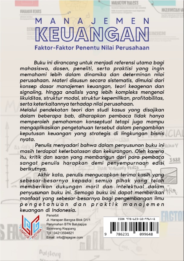 Buku ini dirancang untuk menjadi referensi utama bagi mahasiswa, dosen, peneliti, serta praktisi yang ingin memahami lebih dalam dinamika dan determinan nilai perusahaan. Materi disusun secara sistematis, dimulai dari konsep dasar manajemen keuangan, teori keagenan dan signaling, hingga analisis yang lebih kompleks mengenai likuiditas, struktur modal, struktur kepemilikan, profitabilitas, serta keterkaitannya terhadap nilai perusahaan.