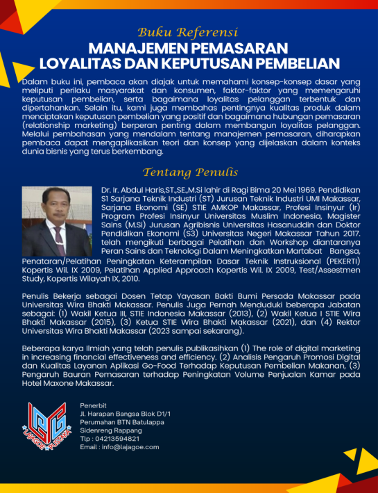 Dalam buku ini, pembaca akan diajak untuk memahami konsep-konsep dasar yang meliputi perilaku masyarakat dan konsumen, faktor-faktor yang memengaruhi keputusan pembelian, serta bagaimana loyalitas pelanggan terbentuk dan dipertahankan. Selain itu, kami juga membahas pentingnya kualitas produk dalam menciptakan keputusan pembelian yang positif dan bagaimana hubungan pemasaran (relationship marketing) berperan penting dalam membangun loyalitas pelanggan. Melalui pembahasan yang mendalam tentang manajemen pemasaran, diharapkan pembaca dapat mengaplikasikan teori dan konsep yang dijelaskan dalam konteks dunia bisnis yang terus berkembang.
