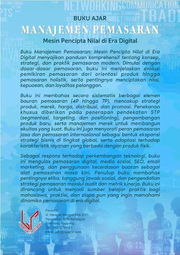 Ditujukan bagi mahasiswa Sarjana dan Pascasarjana di bidang manajemen dan bisnis, serta para praktisi pemasaran yang ingin mempertajam wawasan strategisnya, buku ini bukan hanya sekadar kumpulan teori. Ini adalah panduan komprehensif untuk membangun pola pikir seorang ahli strategi pemasaran yang mampu membuat keputusan yang lebih baik, menghadapi realitas pasar, dan pada akhirnya, membangun mesin pencipta nilai yang berkelanjutan di era digital.